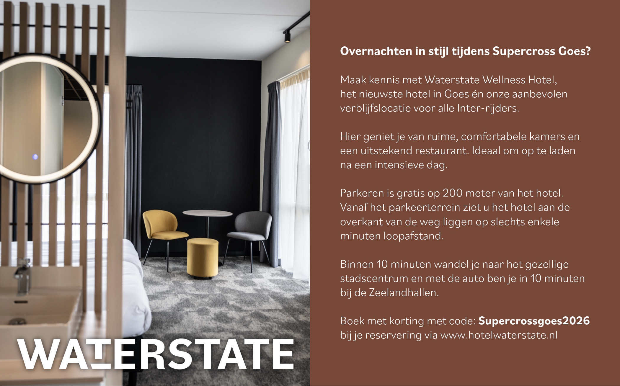 Voor boeking met korting, vermeld Supercrossgoes 2026, via hun website https://hotelwaterstate.nl/